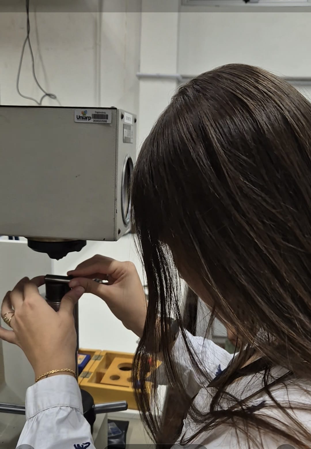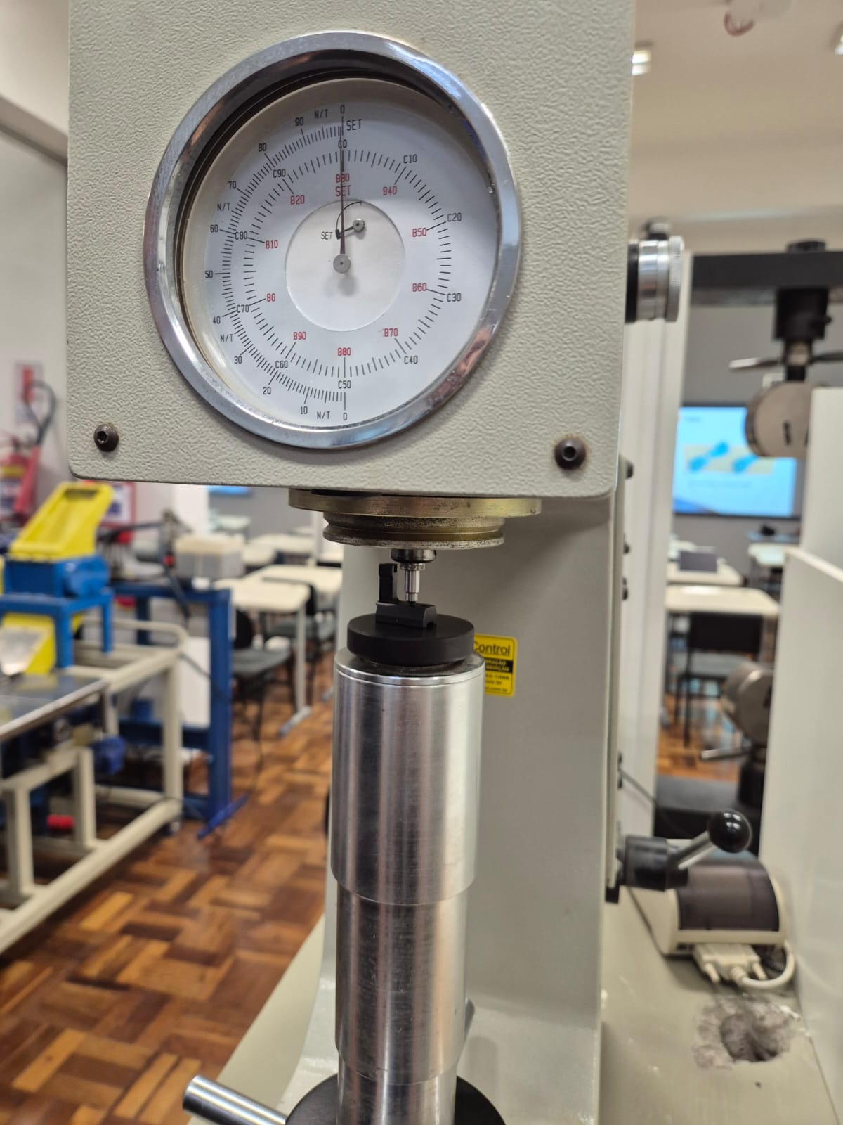 Durante a aula, os acadêmicos aprenderam, na prática, como é feito o teste de dureza dos metais, utilizando um equipamento chamado durômetro. Esse tipo de teste é muito utilizado na indústria para verificar a resistência de peças como eixos e engrenagens, garantindo qualidade e segurança nos produtos.