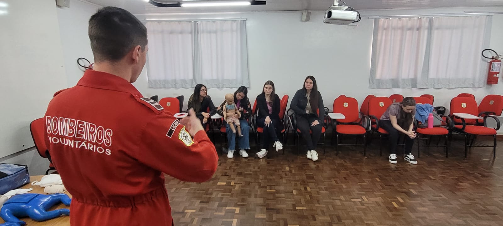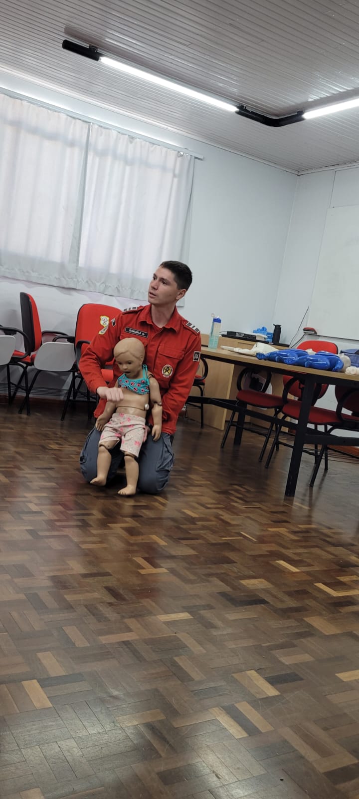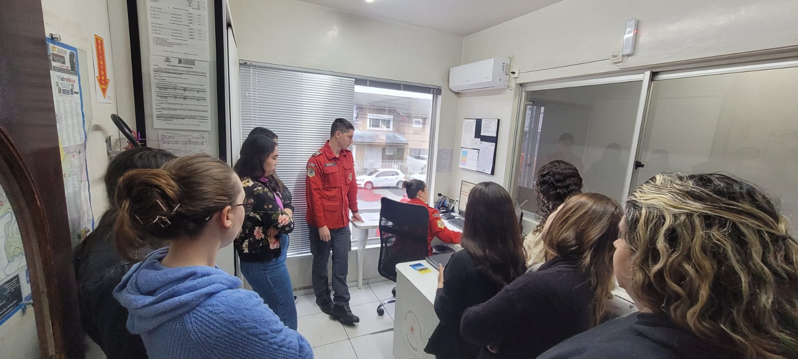 Recebidos no quartel dos bombeiros, os acadêmicos conheceram a central telefônica e os procedimentos de acionamento das viaturas, apresentados pelo bombeiro instrutor Giancarlo. Em seguida, participaram de uma sessão prática em sala de treinamento, com foco em primeiros socorros pediátricos.