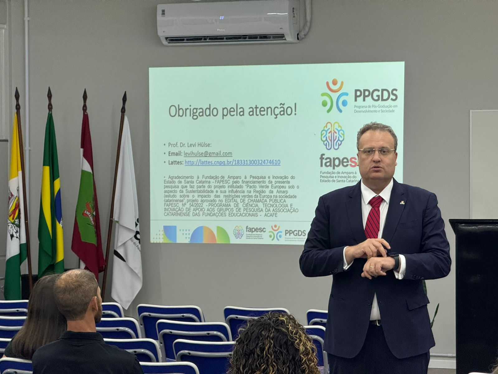 No dia 10 de fevereiro, os acadêmicos do curso de Administração da UNIARP, campus Fraiburgo, participaram de uma Aula Magna fundamental para a compreensão do atual cenário do comércio internacional. O evento foi conduzido pelo professor Dr. Levi Hülse, supervisor do Escritório de Internacionalização da instituição e pesquisador, que aprofundou o tema “European Green Deal e o Impacto nas Exportações”.