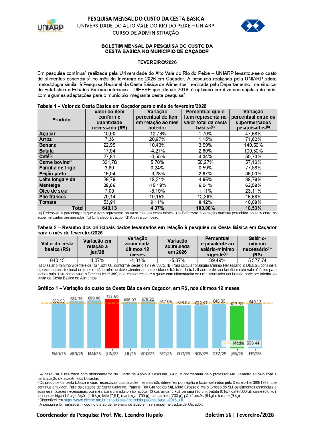 A pesquisa contínua do curso de Administração da UNIARP, financiada pelo FAP e coordenada pelo professor Leandro Hupalo, com execução da bolsista Andressa Pino Garcia, levantou o custo dos alimentos essenciais em fevereiro em Caçador. O estudo segue metodologia do DIEESE, com adaptações locais, e analisa 13 itens da Cesta Básica definidos pelo Decreto-Lei 399/1938, como açúcar, arroz, banana, batata, café, carne, farinha de trigo, feijão, leite, manteiga, óleo de soja, pão francês e tomate.