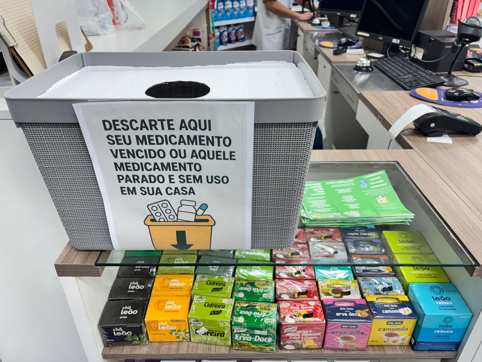 Durante a ação, foram realizadas orientações breves aos clientes, exposição de banners informativos, entrega de panfletos educativos e a instalação de um recipiente para coleta de medicamentos vencidos ou em desuso, que permanece disponível no local por 15 dias.