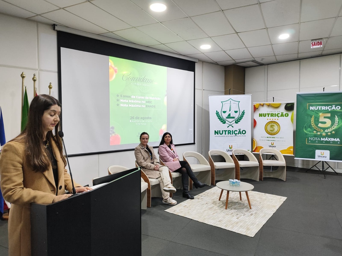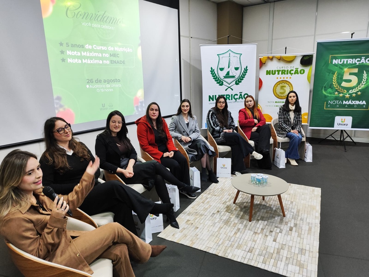 A programação do evento destacou as principais conquistas do curso ao longo dos cinco anos, evidenciando sua atuação científica, acadêmica e extensionista. Um dos momentos mais marcantes foi o painel de egressos, no qual nutricionistas formados pela UNIARP compartilharam suas trajetórias profissionais e experiências de vida. Os depoimentos emocionaram os presentes e motivaram os atuais acadêmicos, reforçando o impacto positivo da formação recebida na universidade.