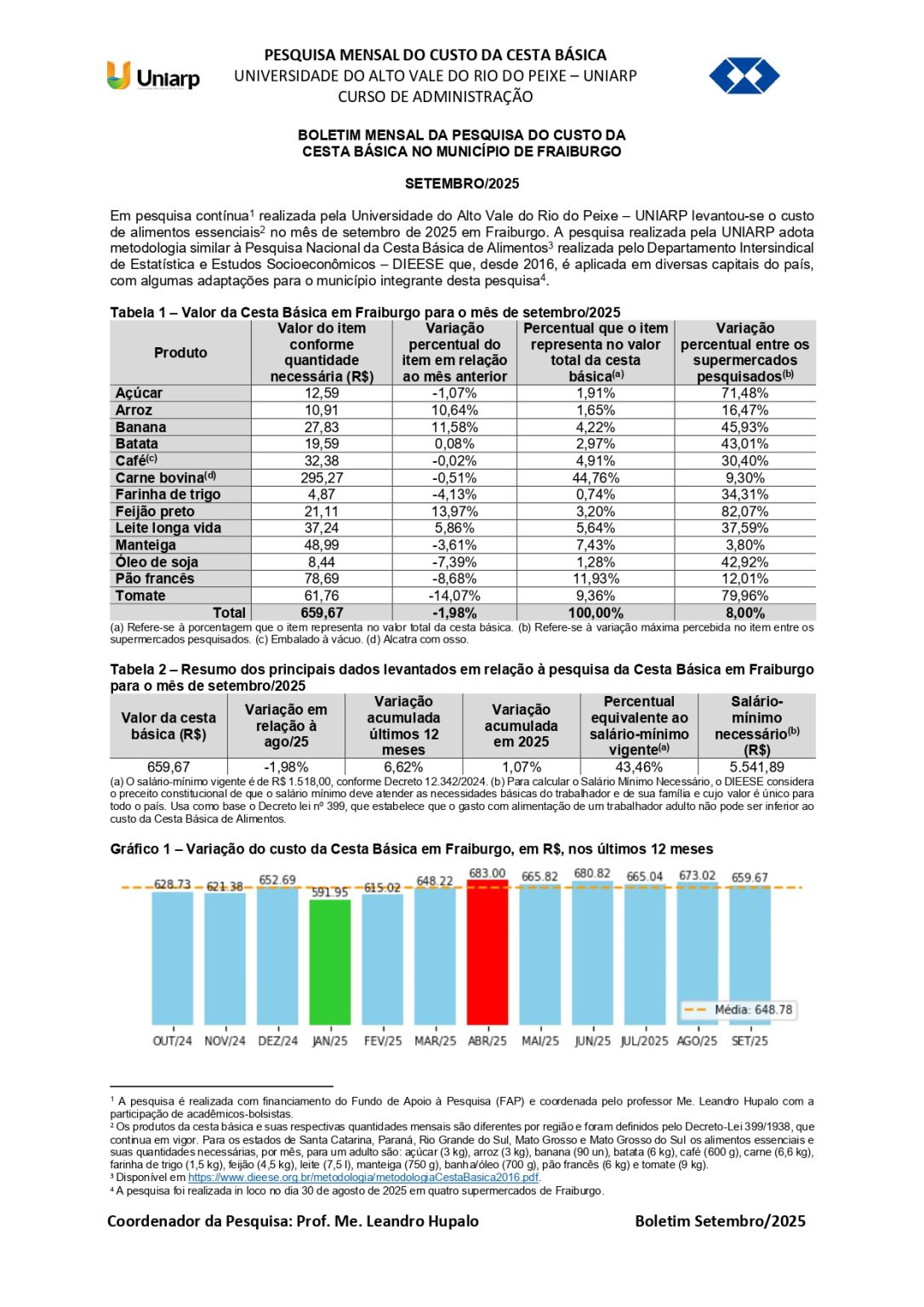 Em pesquisa contínua realizada pelo Curso de Administração da Universidade do Alto Vale do Rio do Peixe – UNIARP levantou-se o custo de alimentos essenciais no mês de setembro em Fraiburgo. A pesquisa realizada pela UNIARP, com recursos do Fundo de Apoio à Pesquisa (FAP) e coordenada pelo professor Leandro Hupalo e executada pela bolsista Larissa Padilha, adota metodologia similar à Pesquisa Nacional da Cesta Básica de Alimentos realizada pelo Departamento Intersindical de Estatística e Estudos Socioeconômicos – DIEESE que é aplicada em diversas capitais do país, com algumas adaptações para o município integrante desta pesquisa. A pesquisa afere o custo de 13 itens, entre eles: açúcar, arroz, banana, batata, café, carne, farinha de trigo, feijão, leite, manteiga, óleo de soja, pão francês e tomate em quantidade definida pelo Decreto-Lei 399/1938.