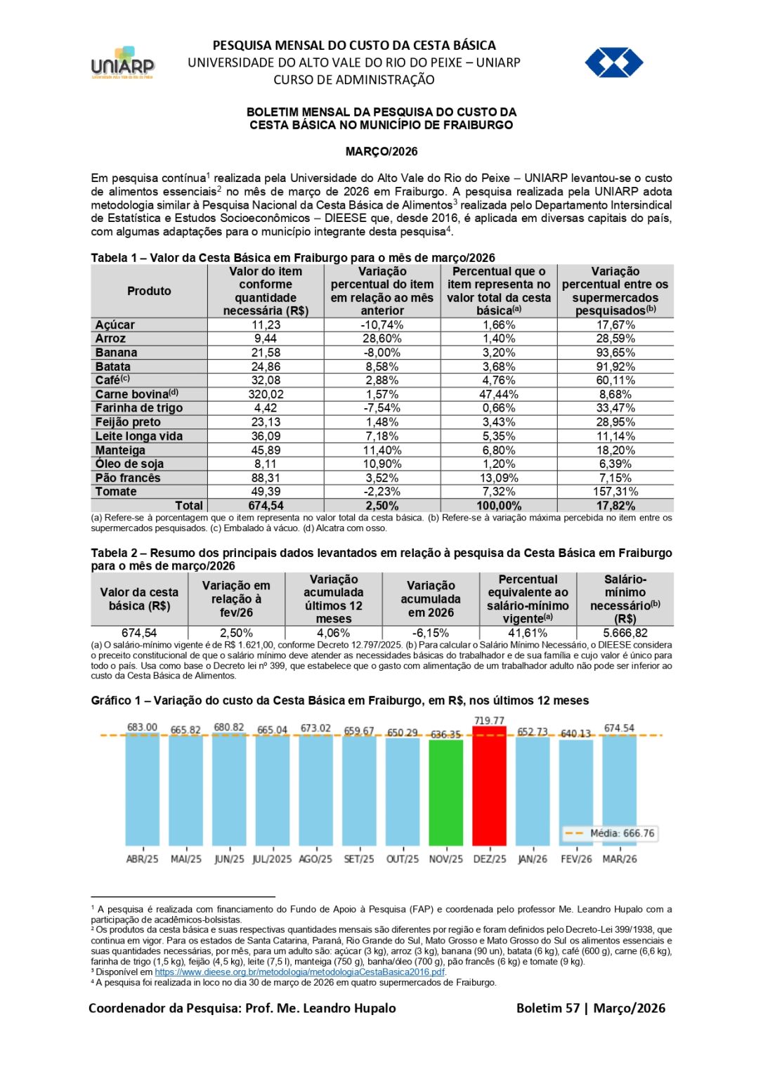 Em pesquisa contínua realizada pelo Curso de Administração da Universidade Alto Vale do Rio do Peixe (UNIARP) levantou-se o custo de alimentos essenciais no mês de março em Fraiburgo. A pesquisa realizada pela UNIARP, vinculada ao Laboratório Júnior e com recursos do Fundo de Apoio à Pesquisa (FAP) e coordenada pelo professor Leandro Hupalo e executada pela bolsista Larissa Padilha, adota metodologia similar à Pesquisa Nacional da Cesta Básica de Alimentos realizada pelo Departamento Intersindical de Estatística e Estudos Socioeconômicos (DIEESE) que é aplicada em diversas capitais do país, com algumas adaptações para o município integrante desta pesquisa. A pesquisa afere o custo de 13 itens, entre eles: açúcar, arroz, banana, batata, café, carne, farinha de trigo, feijão, leite, manteiga, óleo de soja, pão francês e tomate em quantidade definida pelo Decreto-Lei 399/1938.