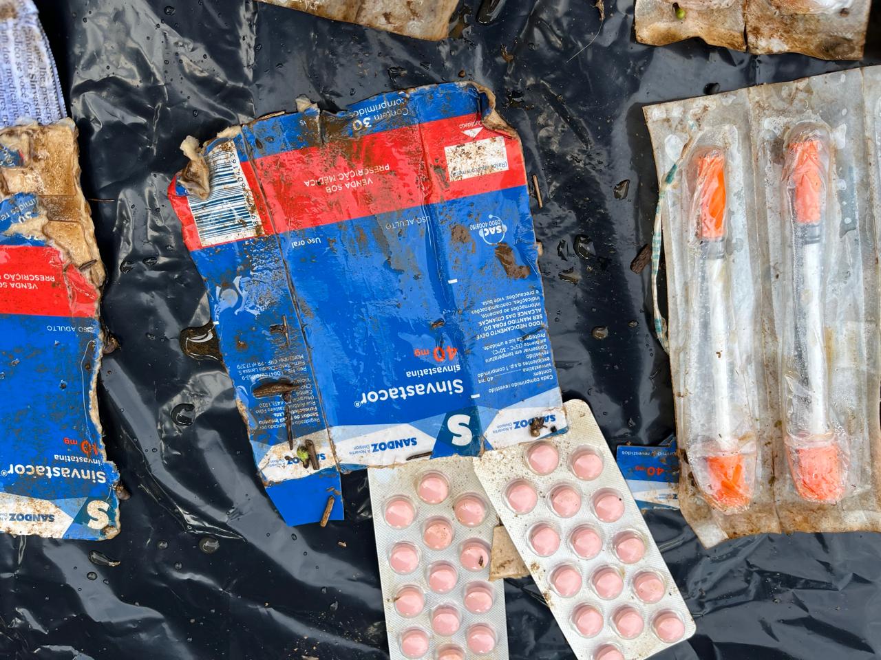 Durante a ação mais recente de monitoramento e limpeza, a equipe identificou um achado preocupante: seringas de insulina novas e medicamentos descartados irregularmente junto ao lixo comum acumulado pela barreira. Embora a quantidade total de resíduos permaneça dentro da média das últimas coletas, o tipo de material encontrado acendeu um alerta sanitário e ambiental.