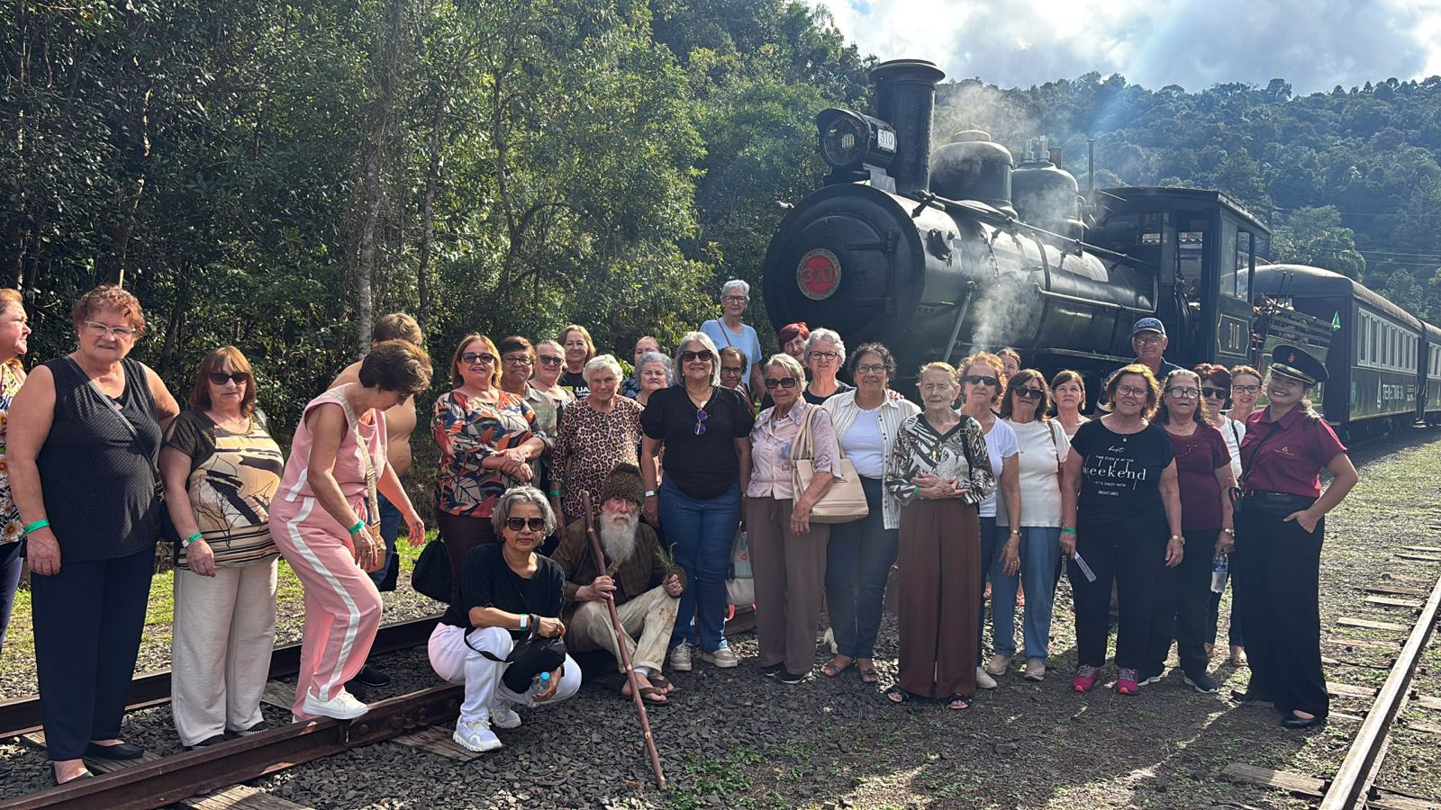 O ponto alto do passeio foi o trajeto a bordo da centenária Maria-Fumaça 310. Partindo do Instituto Cultural Grünenwald, em Porto União, o trem percorreu a divisa entre Santa Catarina e Paraná, proporcionando aos participantes a experiência de cruzar um túnel ferroviário histórico. As fagulhas lançadas pela locomotiva durante o percurso encantaram o grupo, tornando o momento ainda mais especial.