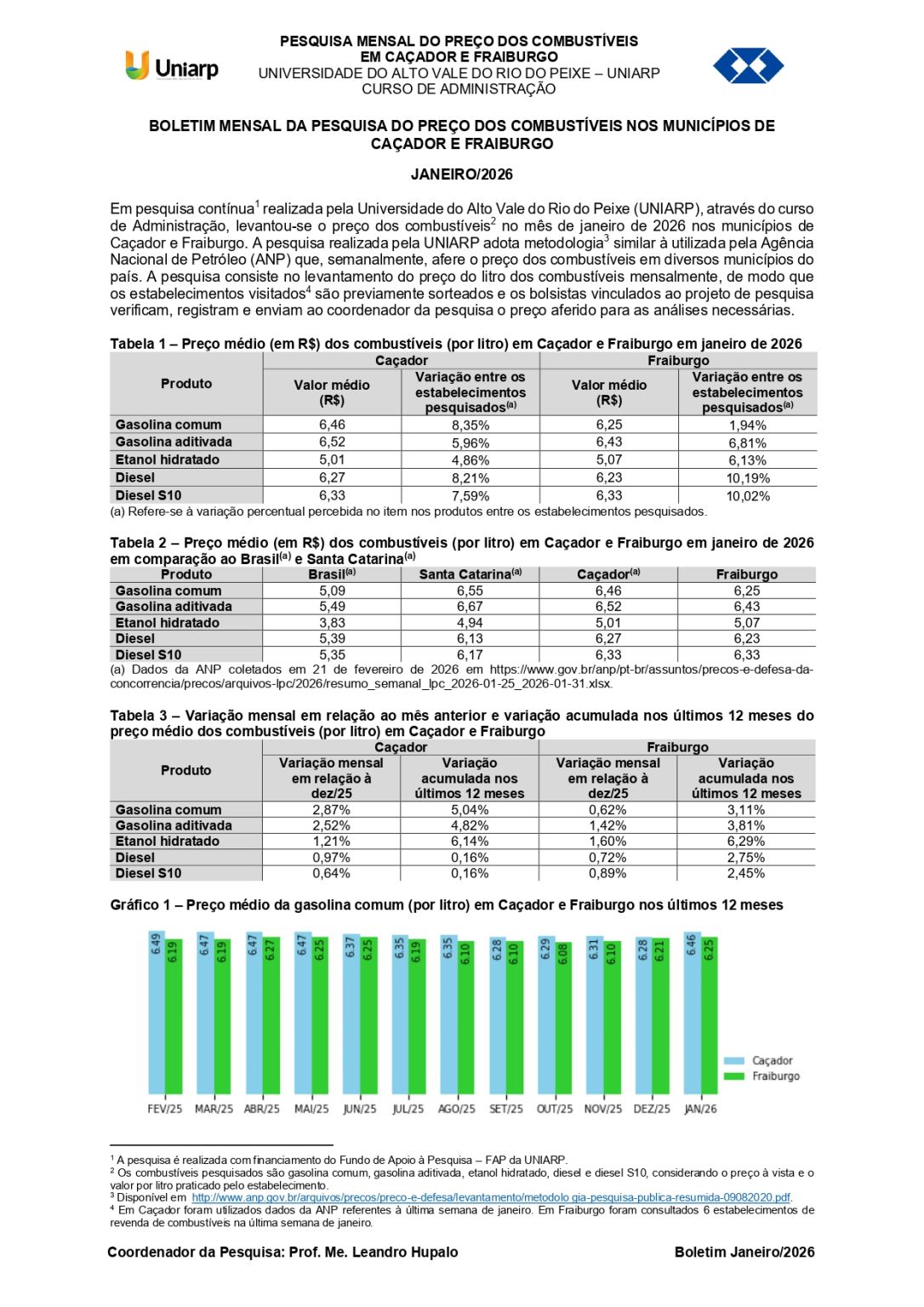 A pesquisa mensal de preços de combustíveis realizada pela Universidade Alto Vale do Rio do Peixe (UNIARP), por meio do curso de Administração e financiada pelo Fundo de Apoio à Pesquisa (FAP), registrou aumento em todos os combustíveis nos municípios de Caçador e Fraiburgo no mês de janeiro. O levantamento segue metodologia similar à utilizada pela Agência Nacional do Petróleo, Gás Natural e Biocombustíveis (ANP). A coordenação é do professor Leandro Hupalo e a execução da bolsista Ana Laura Crestani.