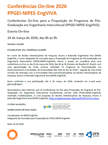 O convite partiu do Núcleo Interdisciplinar de Pesquisa, Ensino e Extensão Engenharia Viva (NIPEE EngVIVA), vinculado à UFG, com o objetivo de reunir especialistas para apoiar a estruturação do Programa de Pós-Graduação em Engenharia Intercultural (PPGEI), que será submetido à CAPES.
