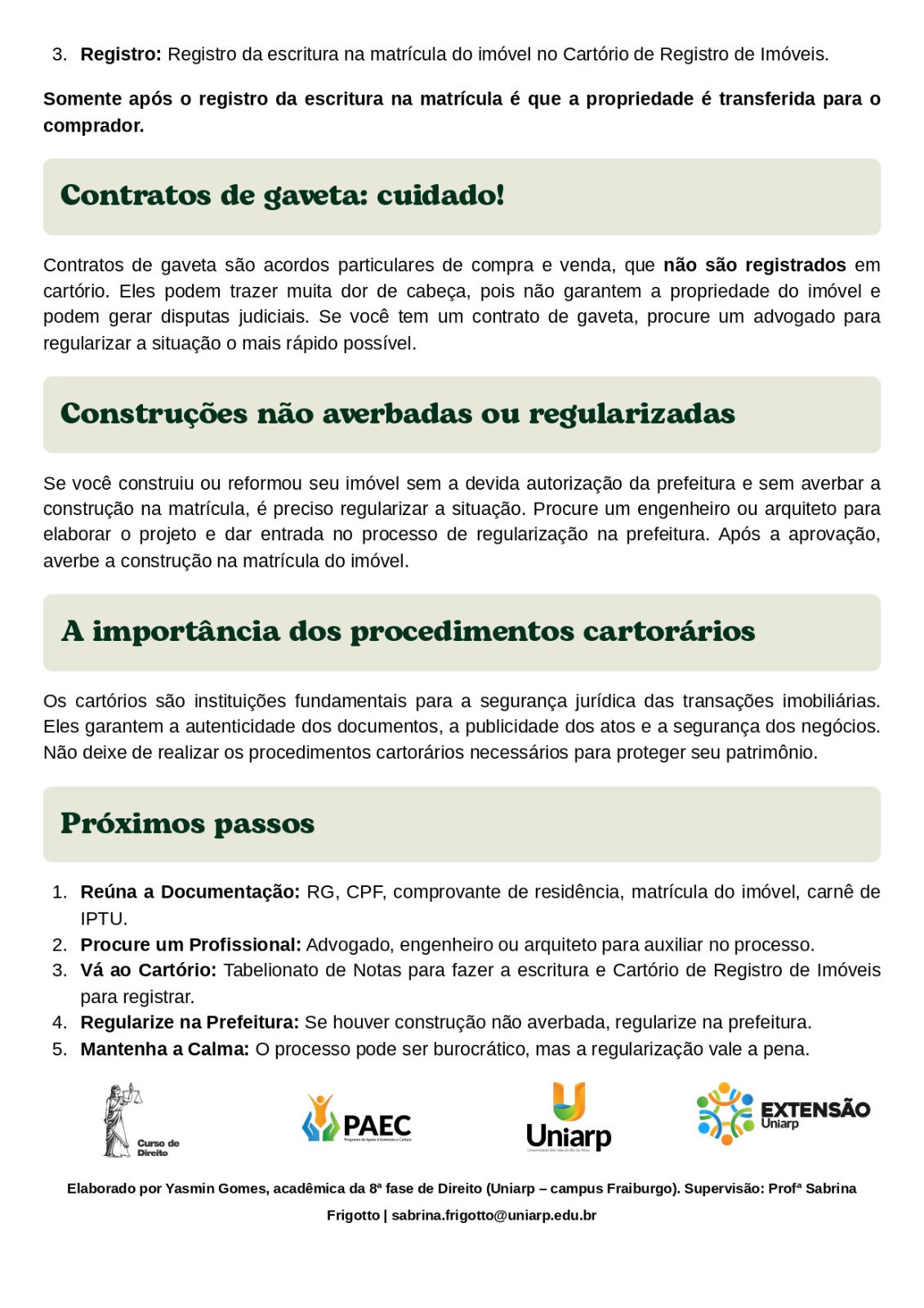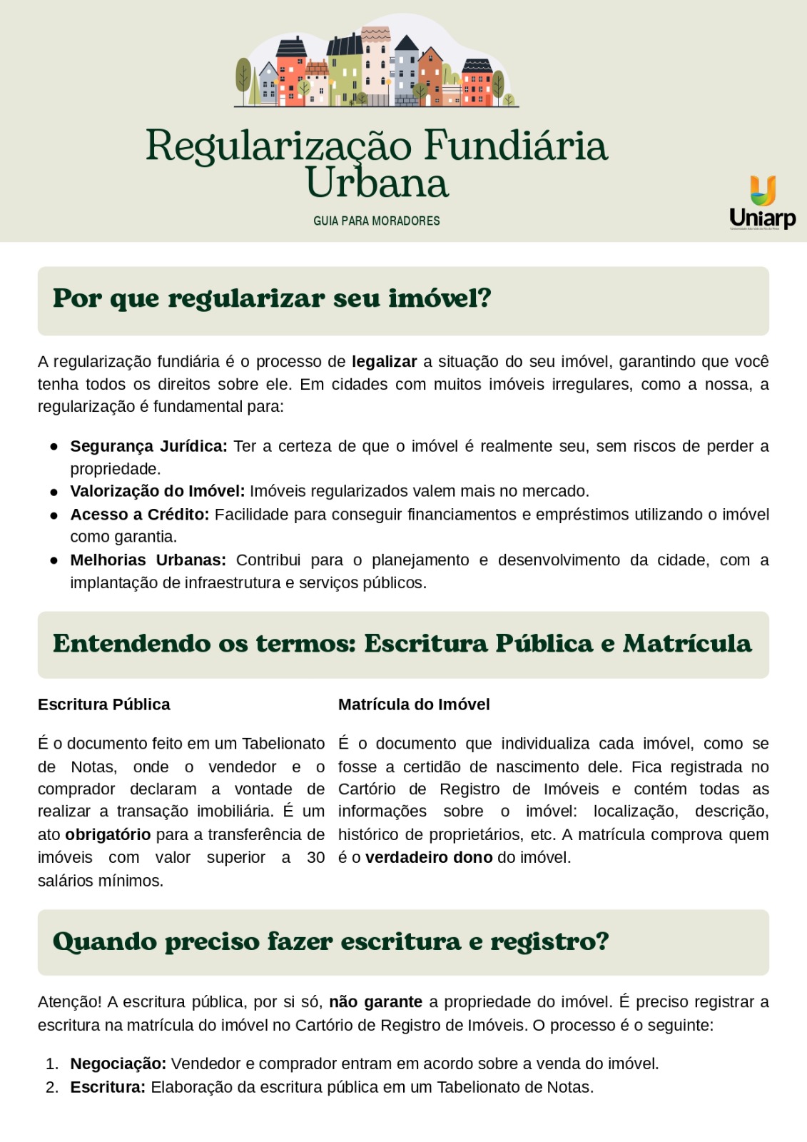 Com base em estudos sobre segurança jurídica, procedimentos cartorários e riscos de contratos particulares, foi elaborada uma cartilha informativa com linguagem acessível, abordando orientações sobre escritura pública, matrícula, etapas para transferência da propriedade, riscos dos contratos de gaveta, importância da averbação de construções e benefícios sociais e econômicos da regularização.