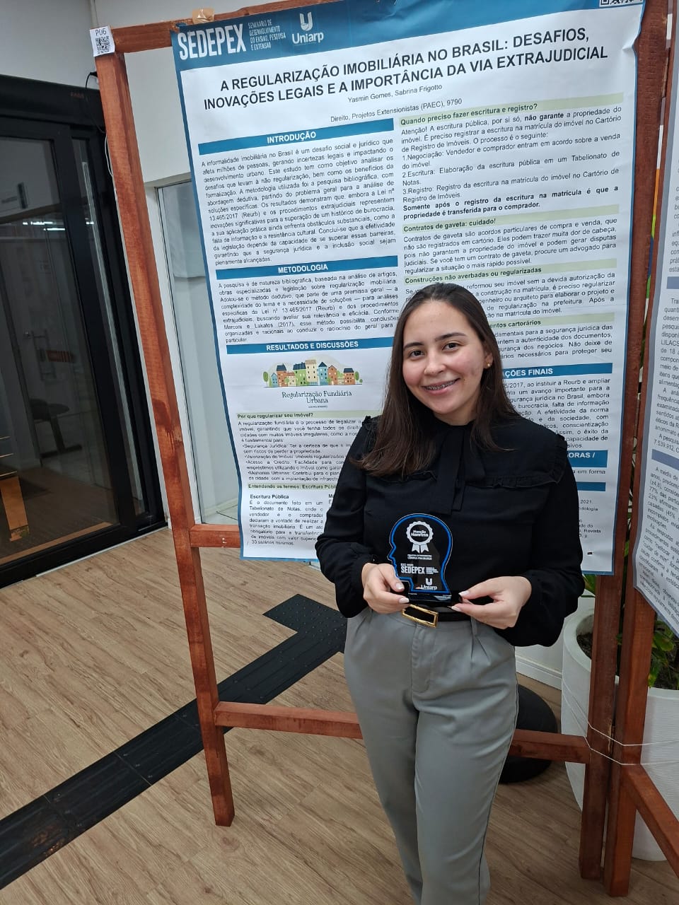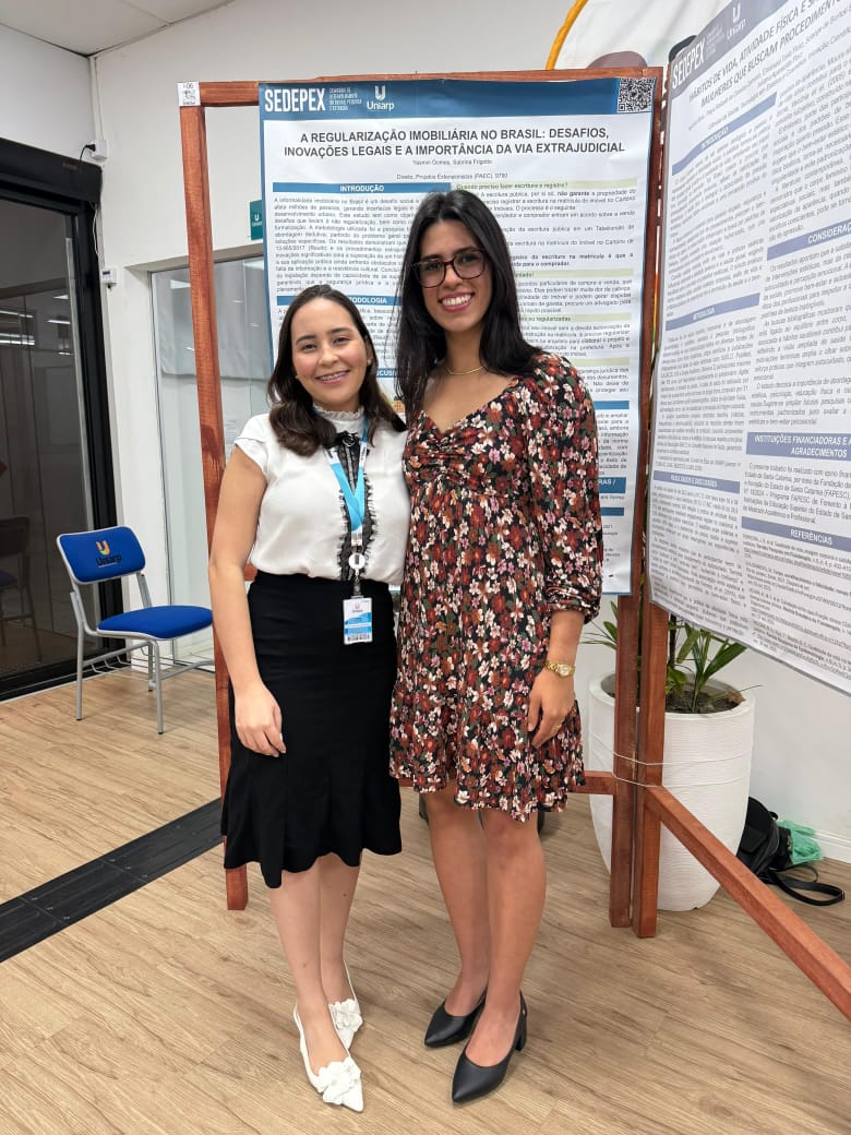 O projeto também ganhou destaque científico. Yasmin apresentou no SEDEPEX – Seminário de Desenvolvimento Científico e Extensão da UNIARP o trabalho “A Regularização Fundiária no Brasil: desafios, inovações legais e a importância da via extrajudicial”, elaborado a partir de revisão bibliográfica.