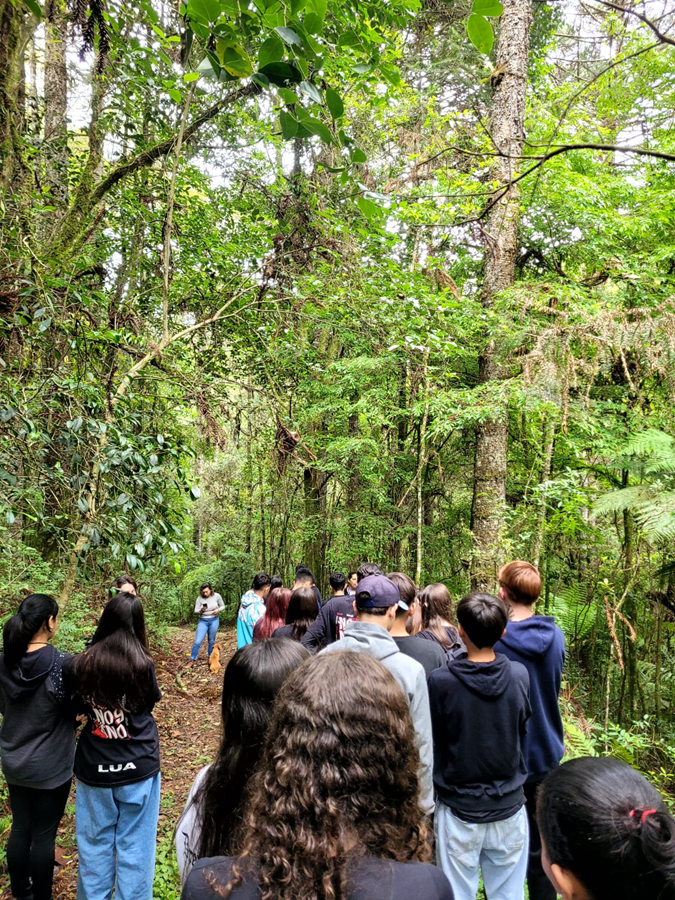 A trilha foi conduzida pela equipe do Horto Municipal, que guiou o grupo até a cachoeira e compartilhou informações sobre o ambiente e sua preservação. As monitoras Leticia Amancio e Louise de Borba, acompanhadas pela professora Evelyn Gabriela Dalla Santa, estiveram presentes dando suporte aos estudantes durante toda a atividade.