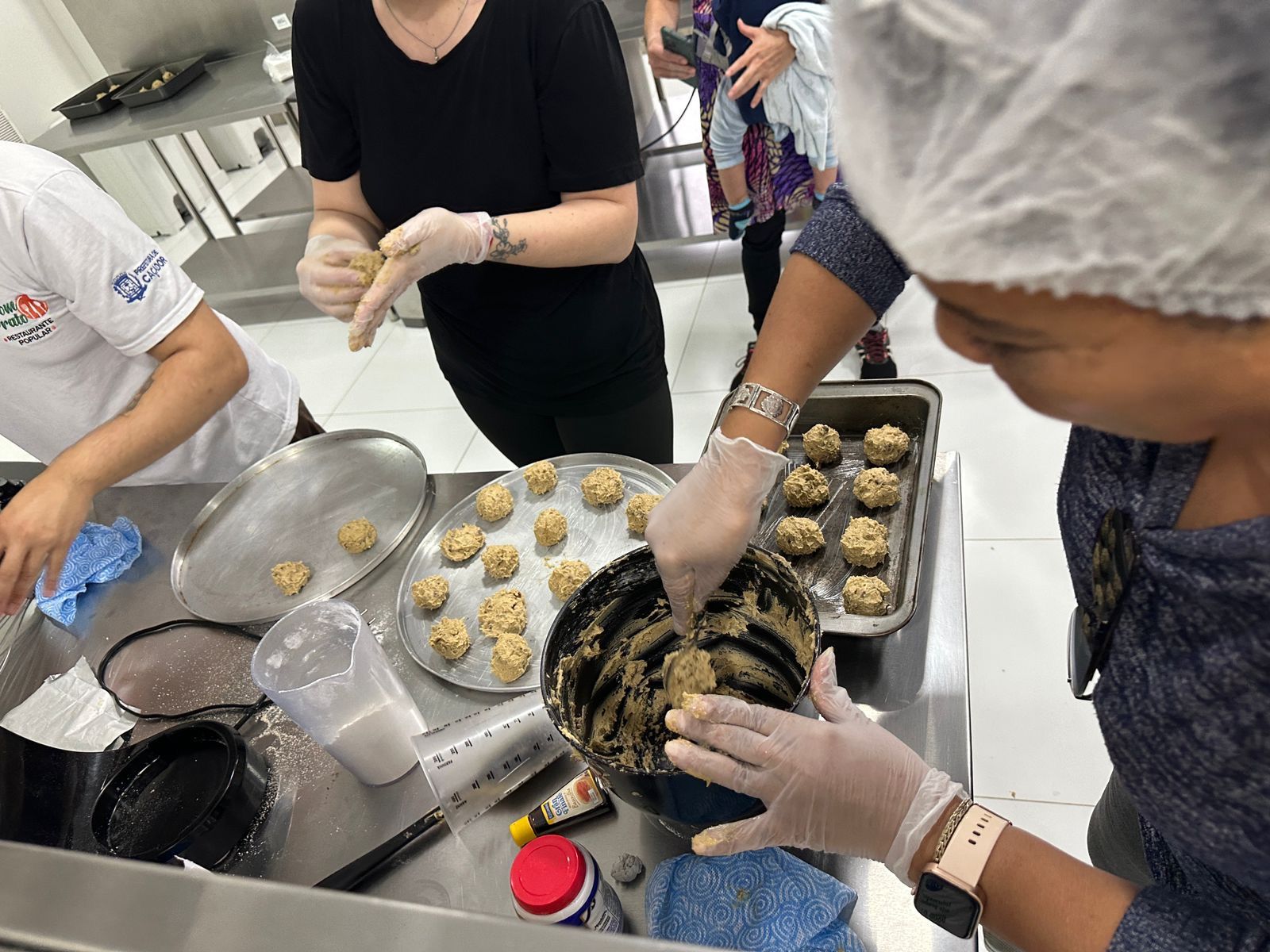 Durante a oficina, foram preparadas duas receitas: uma com ingredientes mais saudáveis e outra com ingredientes mais comuns, permitindo aos participantes uma experiência comparativa e educativa sobre escolhas alimentares.