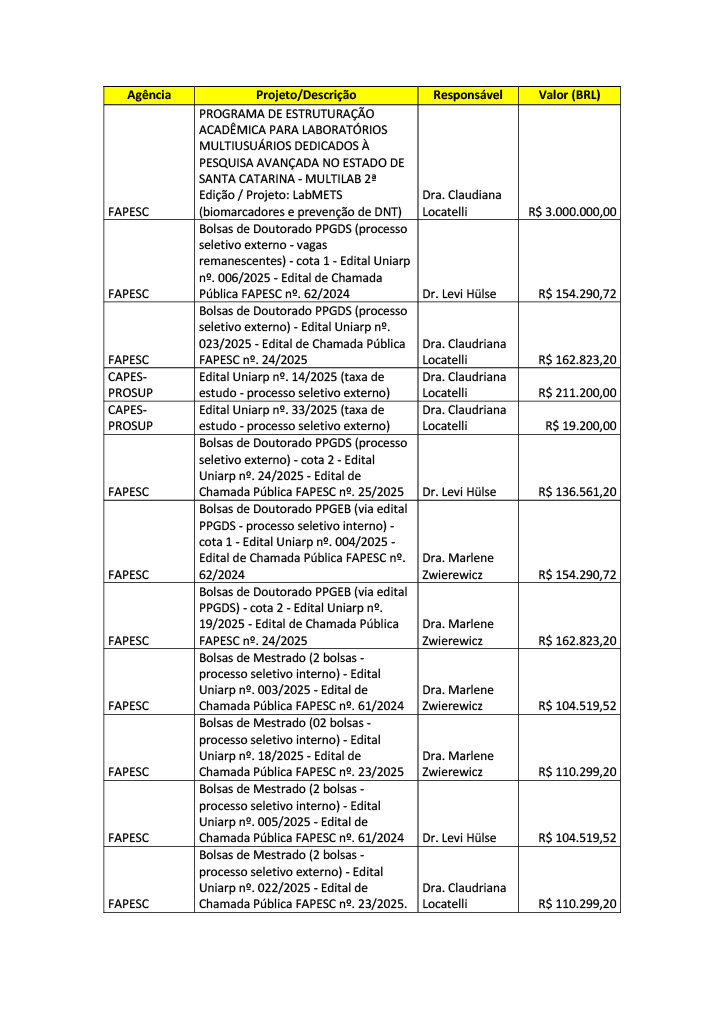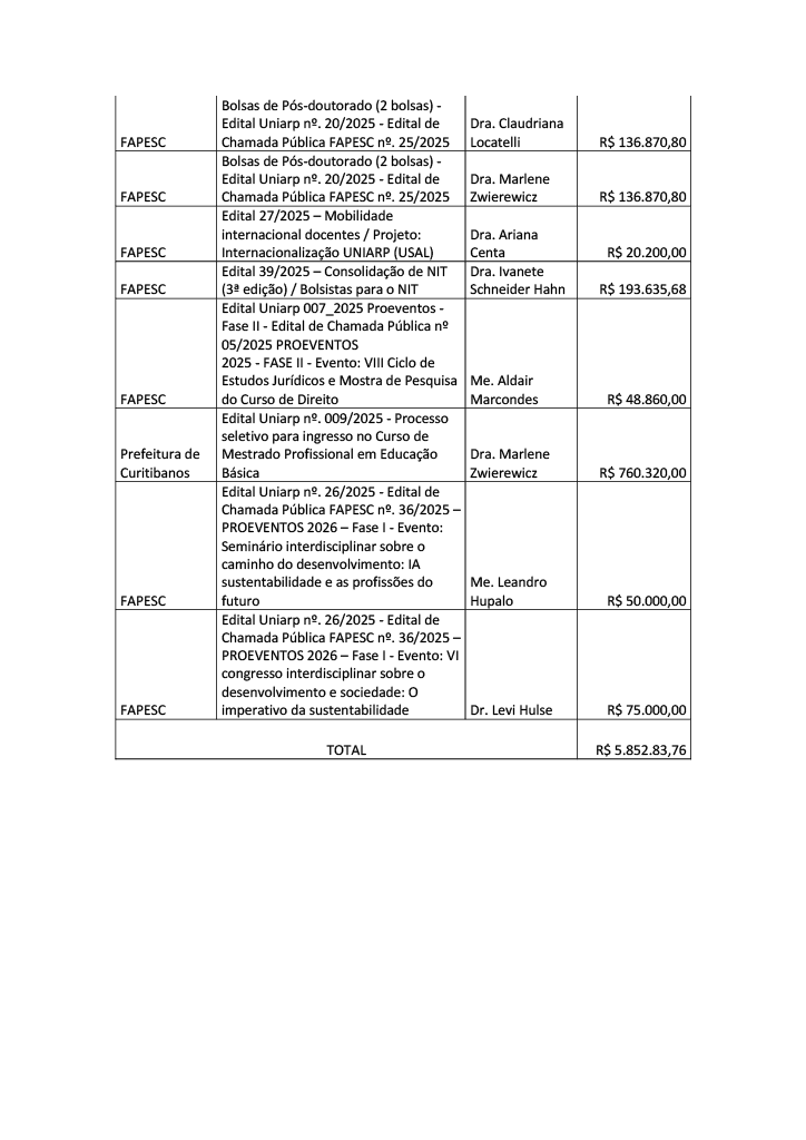 Os valores expressivos são resultado de projetos submetidos por pesquisadores da UNIARP a órgãos de fomento nacionais e estaduais, como FAPESC e CAPES, além de parcerias com prefeituras.