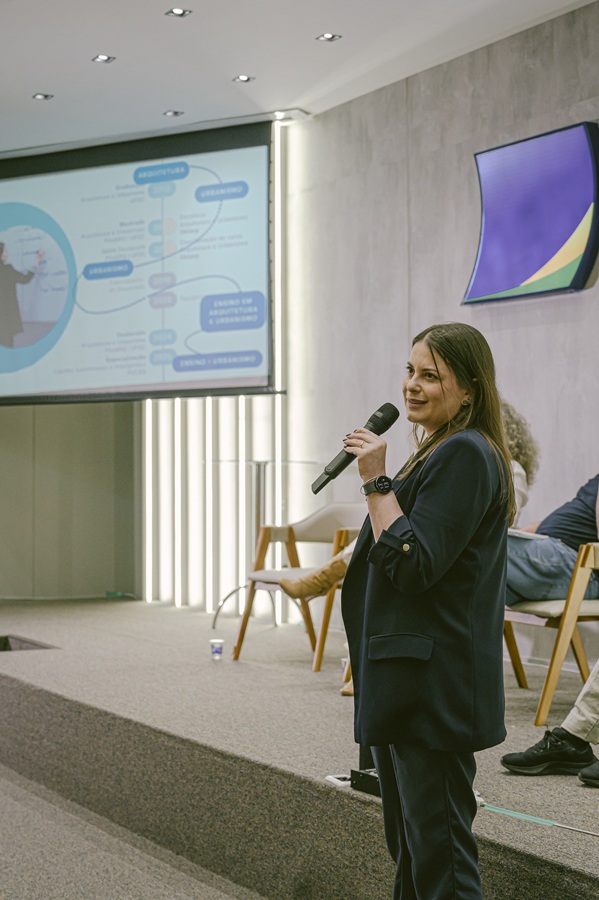 Durante a mesa “Diálogos sobre Ensino e Formação”, mediada pelo conselheiro Newton Marçal, a professora Cláudia Maté representou a UNIARP ao lado da coordenadora Kareen Cristina Zanela Diener e do professor Gogliardo Vieira Maragno, representante da Associação Brasileira de Ensino de Arquitetura e Urbanismo (ABEA).