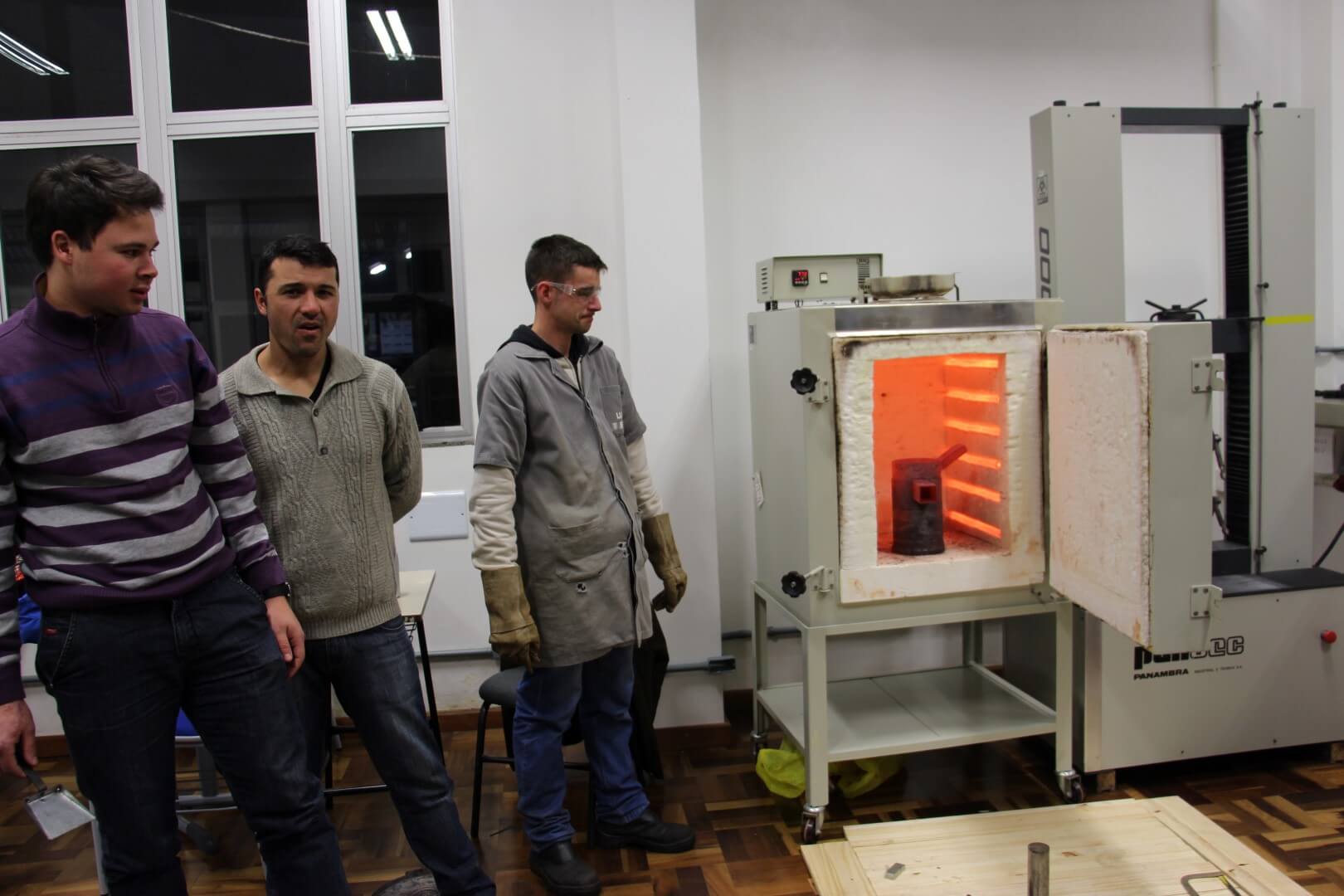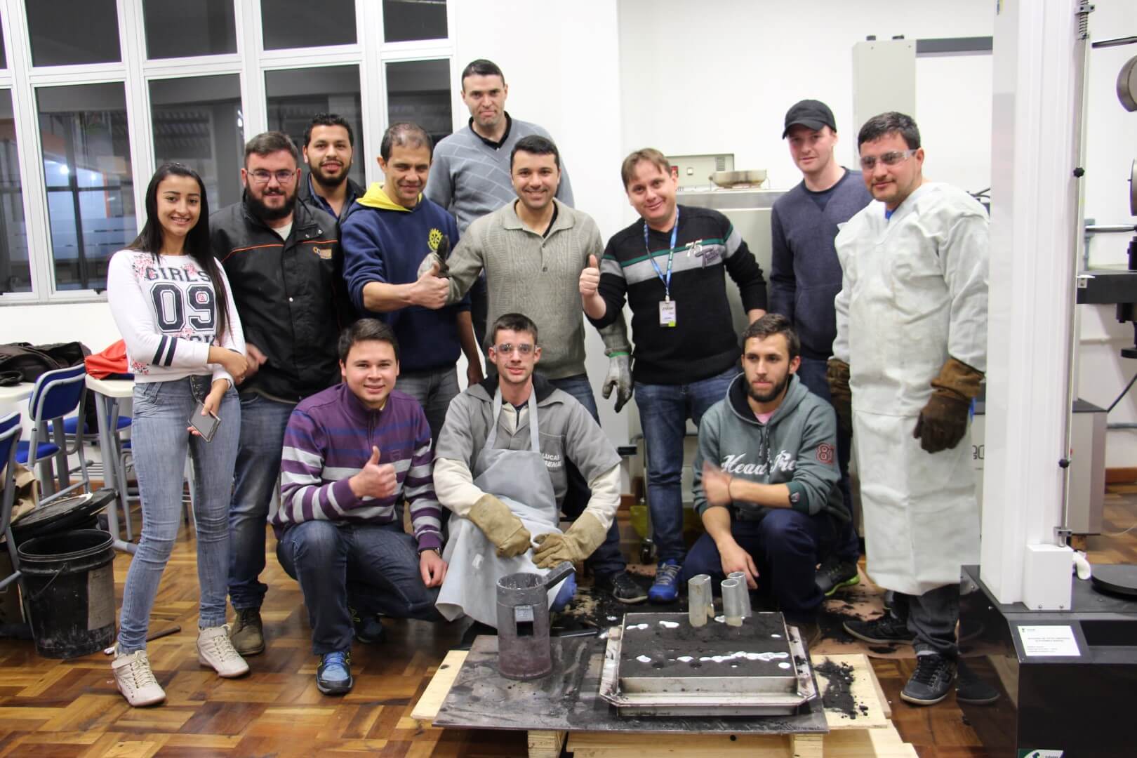 “A fundição é um processo de fabricação comumente empregado na área metal mecânica para a produção de peças de aço ou ferro, que consiste em vazar o metal líquido em um molde. Tais peças dificilmente seriam produzidas em outros processos de fabricação, devido a sua complexidade geométrica, tamanho e peso”, explica o professor. Seguindo rigorosamente as noções de segurança, o procedimento foi realizado com sucesso. Conhecer esse processo é muito importante para o profissional da área mecânica, independente do setor de atuação.