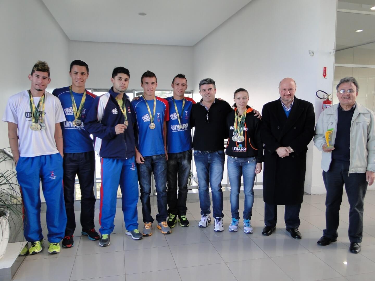 A equipe de atletismo de Caçador, representando a UNIARP participou dia 09 de agosto dos 58o Jogos Universitários Catarinenses (JUCS), em Itajaí. Na bagagem, os atletas trouxeram várias medalhas e ainda o troféu de terceiro lugar geral da competição. A equipe participante foi composta pelos atletas: Luy Mauriky, Lucas Nunes, Andre Vatrin, Luiz Felipe Nunes e Ana Paula Bertazi. Nesta quinta-feira, os atletas acompanhados de João Coelho, da Fundação Municipal de Esportes, realizaram a entrega do troféu para Adelcio Machado dos Santos, reitor da Uniarp e para Jorge Velasquez, coordenador do curso de Educação Física.
