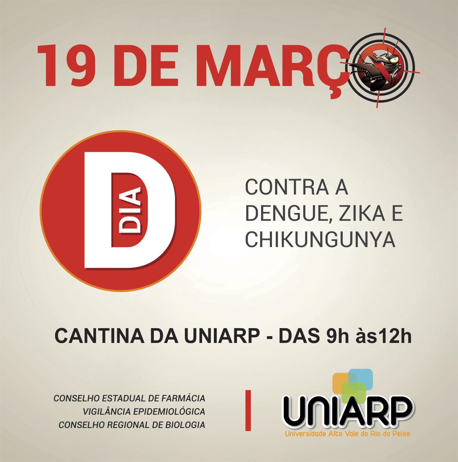 A Universidade Alto Vale do Rio do Peixe (UNIARP), através dos cursos de Farmácia e Ciências Biológicas realiza dia 19 de março uma grande ação de mobilização com o objetivo de eliminar possíveis criadouros do mosquito Aedes aegypti, que transmite os vírus da dengue, da febre chikungunya e da zika. A ação envolverá acadêmicos, professores e colaboradores das 9h às 12 horas.