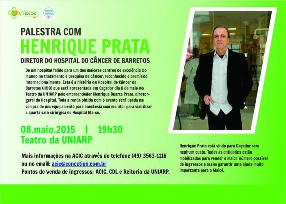 Colabore- O evento com Henrique Prata está sendo organizado pelo Conselho Consultivo do Hospital Maicé, que reúne diversas entidades de classe de Caçador. O palestrante está vindo para Caçador sem nenhum custo. Todas as entidades estão mobilizadas para vender o maior número possível de ingressos e assim garantir uma ajuda muito importante para o Hospital.