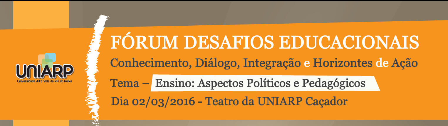 A Universidade Alto Vale do Rio do Peixe (UNIARP) realiza dia 02 de março no Teatro, o Fórum Desafios Educacionais: Conhecimento, Diálogo, Integração e Horizontes de Ação. O evento discutirá o tema: “Ensino: Aspectos políticos e Pedagógicos. O objetivo do evento é aprofundar a discussão do papel político-pedagógico das escolas e, nesse contexto, dos gestores, professores e comunidades na promoção da educação pública. Constituir um espaço de aproximação dos educadores da região de Caçador, voltado ao debate crítico-reflexivo de seus problemas e necessidades, e alimentado por exposições/atividades atuais e pertinentes. Visa também estimular, através de diferentes tipos compartilhados de interação, o gosto pela pesquisa e pelo estudo como formas de melhorar o ensino nas escolas públicas da região. As inscrições podem ser feitas pelo site: www.uniarp.edu.br.