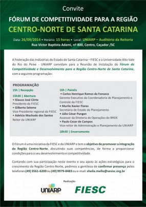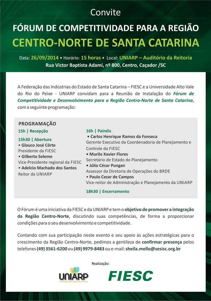 A Federação das Indústrias do Estado de Santa Catarina (FIESC) e a Universidade Alto Vale do Rio do Peixe (UNIARP) realizam nesta sexta-feira (26) em Caçador a Instalação do Fórum de Competitividade e Desenvolvimento para a Região Centro-Norte de Santa Catarina. O evento será realizado no Auditório da Reitoria, às 15 horas.