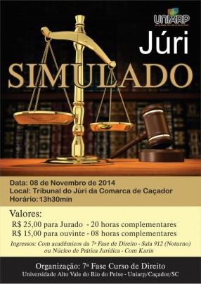 A UNIARP, através do curso de Direito realiza neste sábado, (08) às 13h30min no Tribunal do Júri da Comarca de Caçador o tradicional Júri Simulado. Estarão participando acadêmicos da sétima fase do curso.
