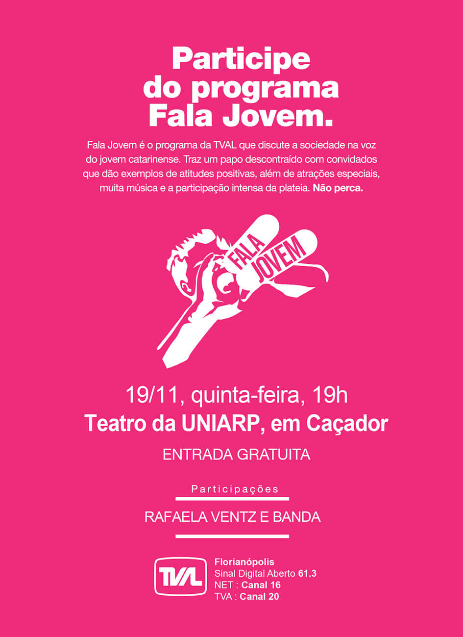 O programa Fala Jovem, da TVAL, a emissora da Assembleia Legislativa de Santa Catarina, chega à UNIARP, em Caçador, no dia 19 de novembro levando debate e música. Os desafios da qualificação profissional e a celebração da cultura local serão foco desta edição, que será transmitida ao vivo, a partir das 19h30min, para toda Santa Catarina direto do Teatro da Universidade Alto Vale do Rio do Peixe.