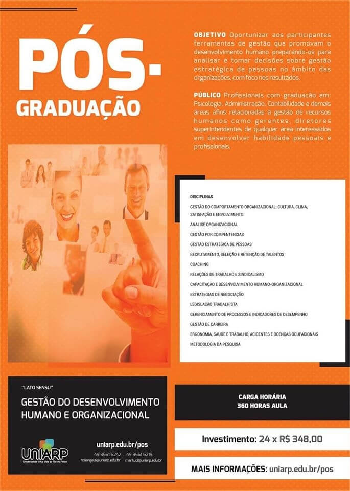 A UNIARP está lançando um novo curso de Pós-Graduação: MBA em Gestão do Desenvolvimento Humano e Organizacional. O curso oportuniza ferramentas de gestão que promovem o desenvolvimento humano preparando os participantes para analisar e tomar decisões sobre gestão estratégica no âmbito das organizações com foco nos resultados.