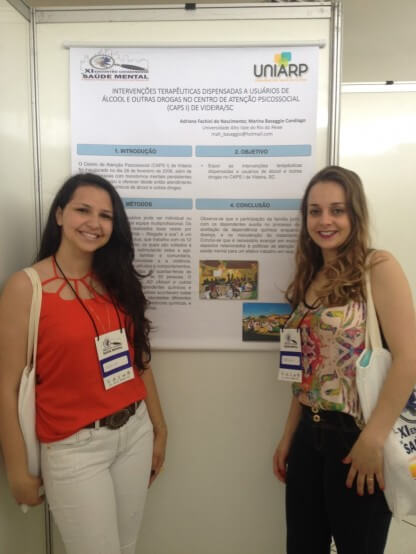 Acadêmicas do curso de Psicologia da UNIARP, Marina Basseggio Candiago e Adriana Fachini do Nascimento, apresentaram trabalho no XI Encontro Catarinense de Saúde Mental (ECSM), realizado nos dias 14, 15 e 16 de outubro de 2015 no Centro de Cultura e Eventos da UFSC em Florianópolis. O evento teve como tema: “A cidade e a saúde: vivências na dimensão psicossocial”.
