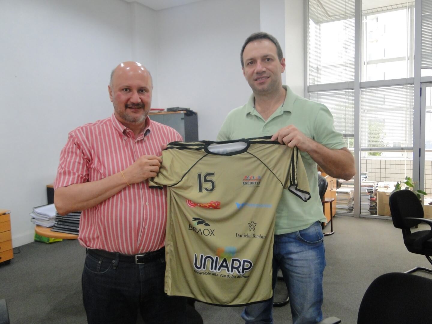 O coordenador de Handebol da Fundação Municipal de Esportes de Caçador Taylor Fischer esteve na UNIARP nesta sexta-feira (14) apresentando ao reitor Adelcio Machado dos Santos a camisa oficial da equipe para a 54ª edição dos Jogos Abertos de Santa Catarina (JASC). O maior evento do esporte catarinense será disputado até o próximo dia 25 na cidade de Itajaí, reunindo quase 5 mil atletas de 90 municípios de todo o Estado. A abertura do evento será neste sábado (15). Boa sorte aos atletas!